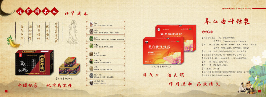公司产品以心脑血管药物、呼吸系统药物为主导,形成以软脉灵口服液、满山白糖浆、眠安宁合剂等18个品种(附药品注册证明细表),其中全国独家剂型产品“眠安宁合剂、满山白胶囊、满山白颗粒、满山白片”及独家产品“软脉灵口服液、桂茸固本丸”;我司独创产品软脉灵口服液曾属国家中药保护品种,荣获全国科学大会奖、中国中药名牌产品、省部级优质产品奖、优秀新产品奖等众多荣誉。